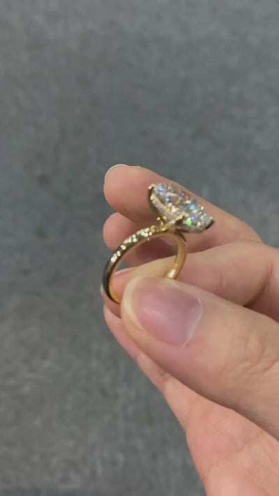 Merkezde yer alan etkileyici oval kesim taşın, etrafındaki mikro pırlanta detaylarla desteklendiği bu özel tasarım; maksimum ışıltı ve dolgun görünüm sunmak üzere tasarlanmıştır. Cluster (çok taşlı) form sayesinde yüzük, tek bir taşın verdiğinden çok daha büyük ve göz alıcı bir etki yaratır.